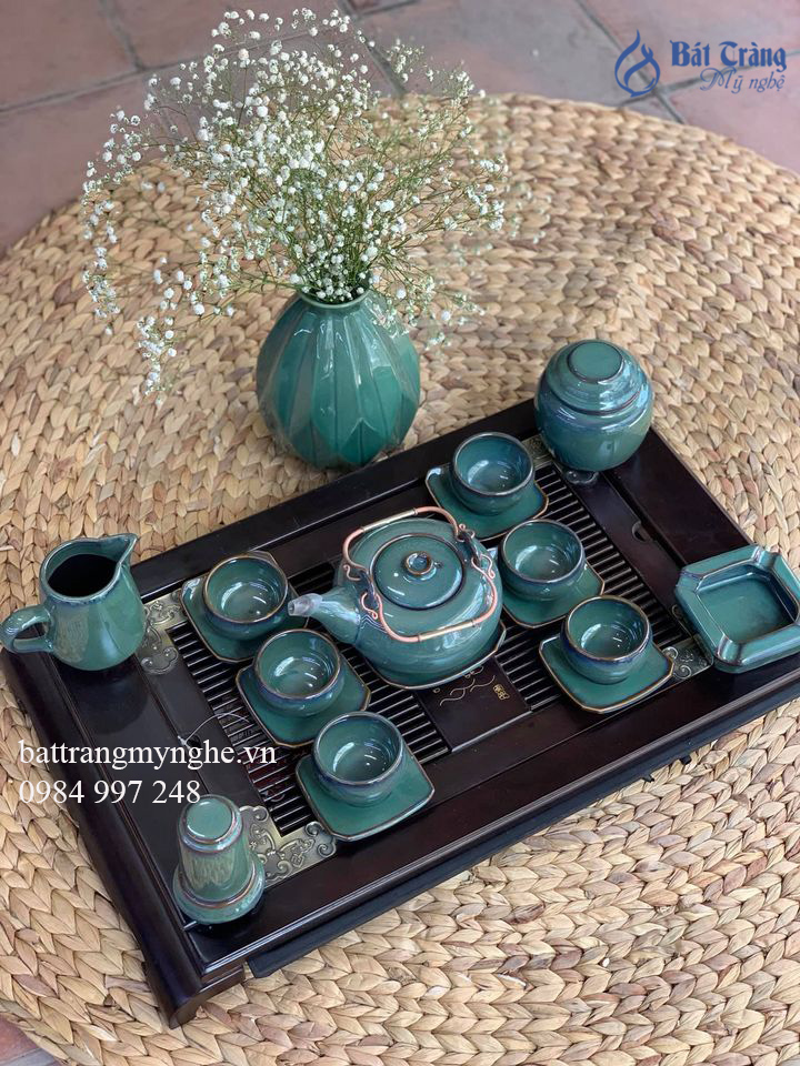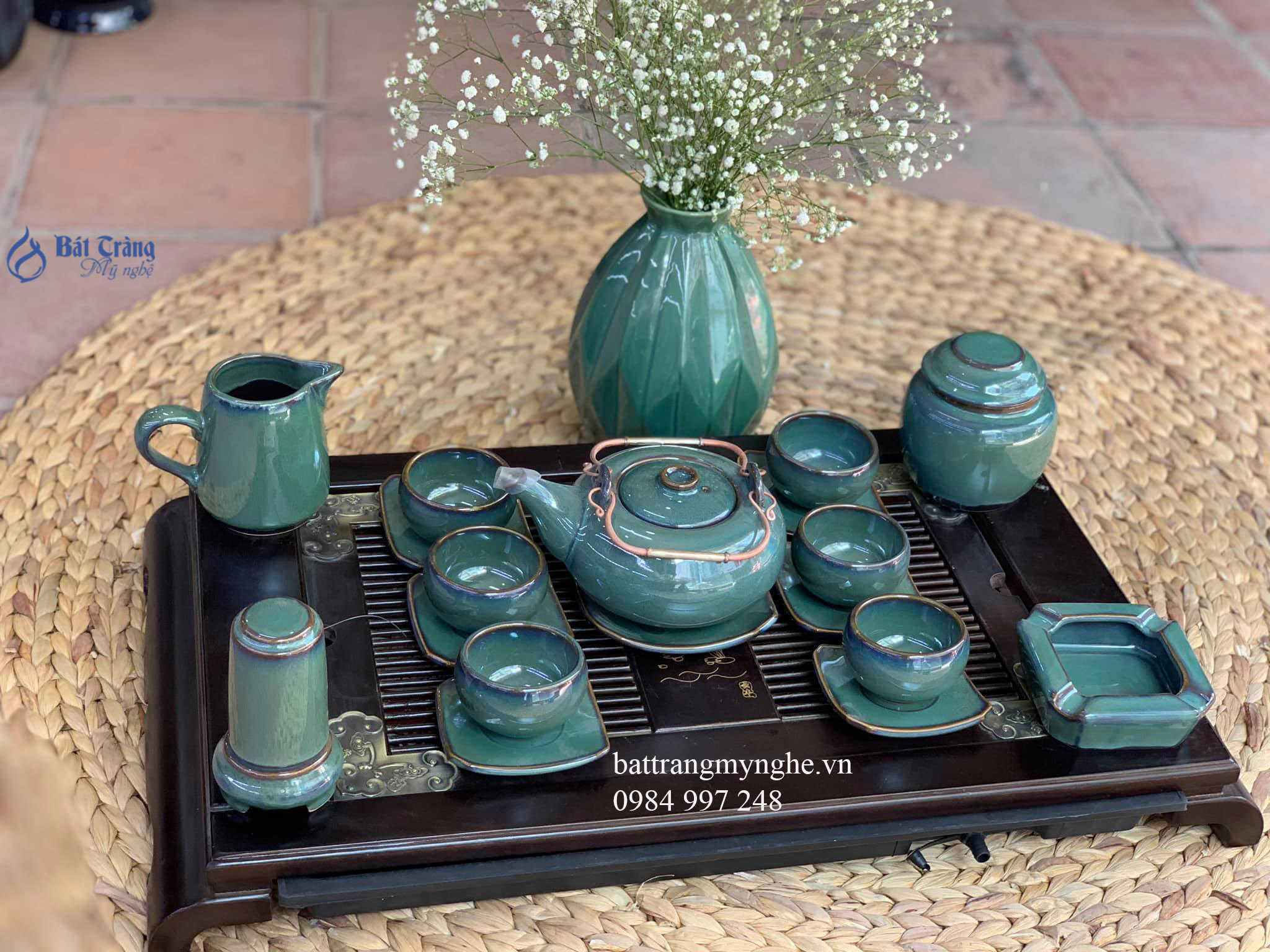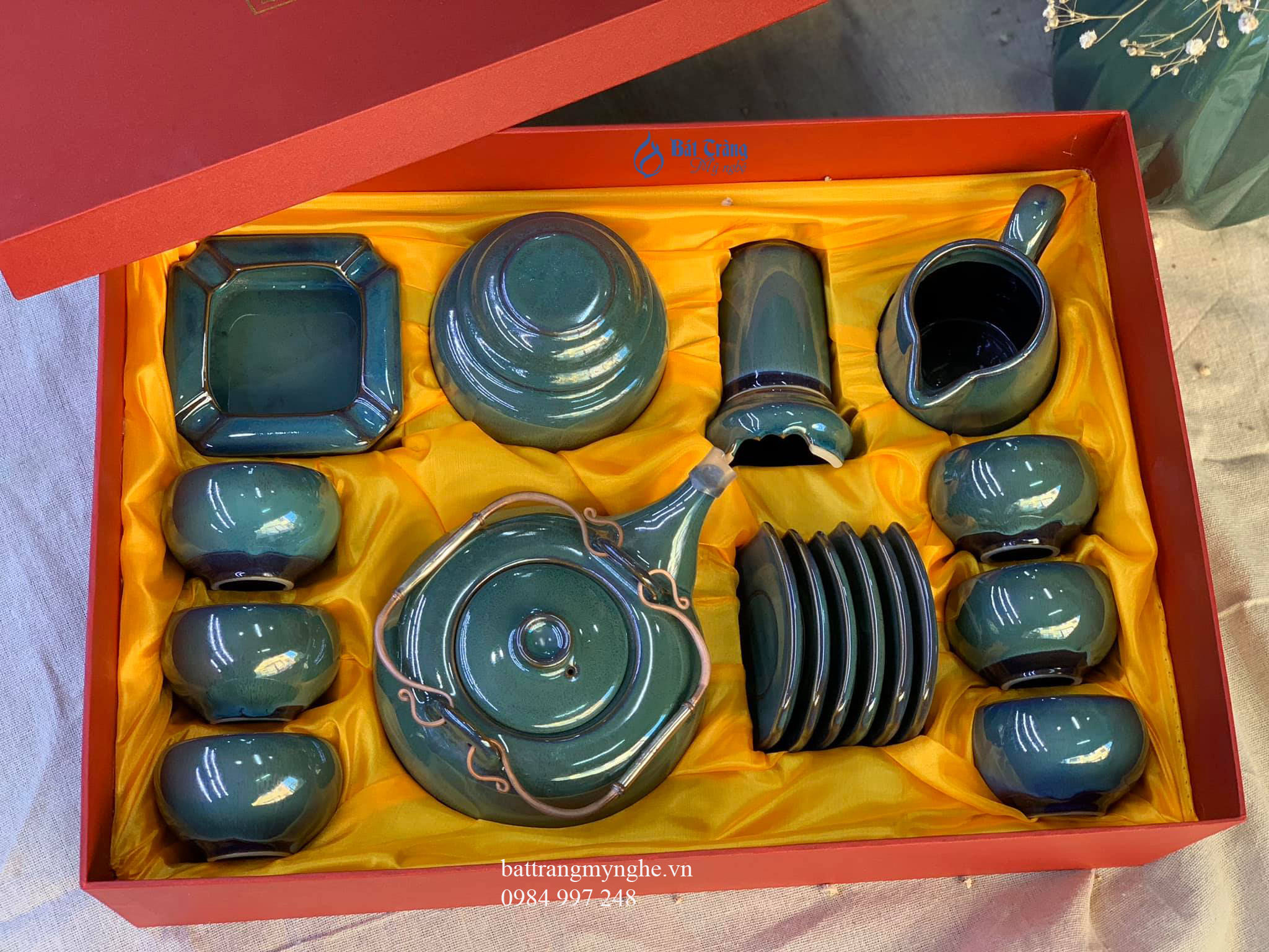 - Sản phẩm bao gồm: 06 chén, 01 ấm, 7 đĩa kê, lọ tăm, hộp chè, lọ đổ nước cặn, gạt tàn
