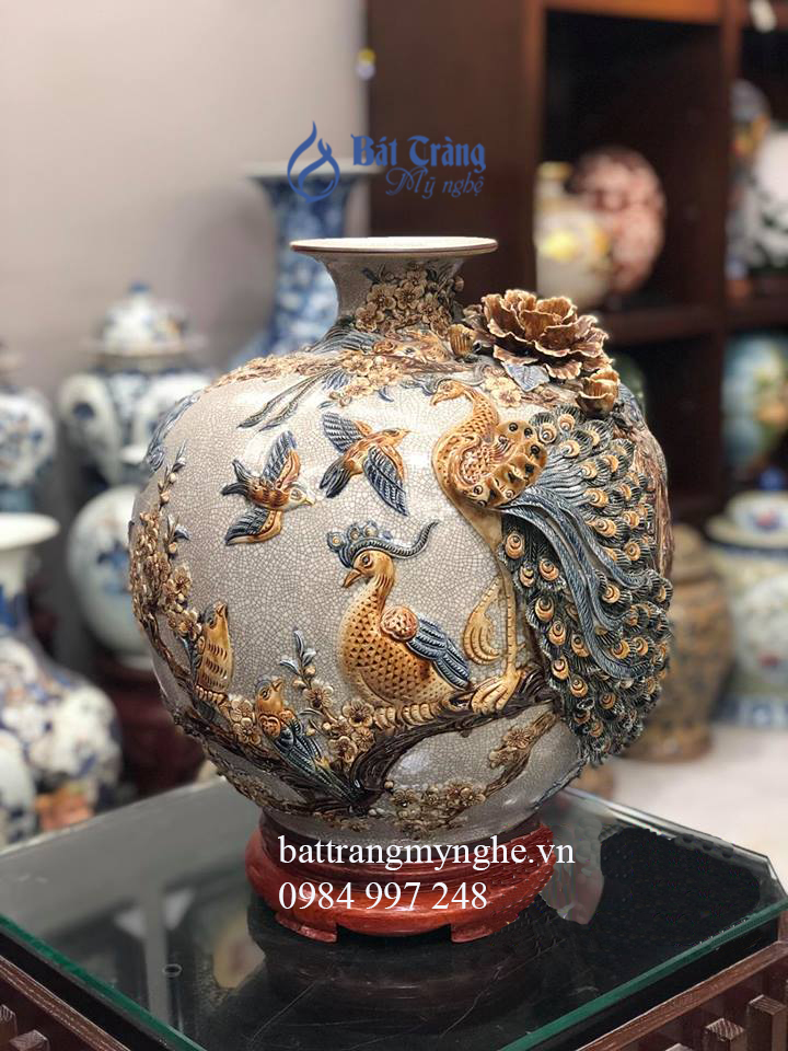 Bình hút lộc đắp nổi chim công cao 40cm chất liệu men rạn cổ Bát Tràng