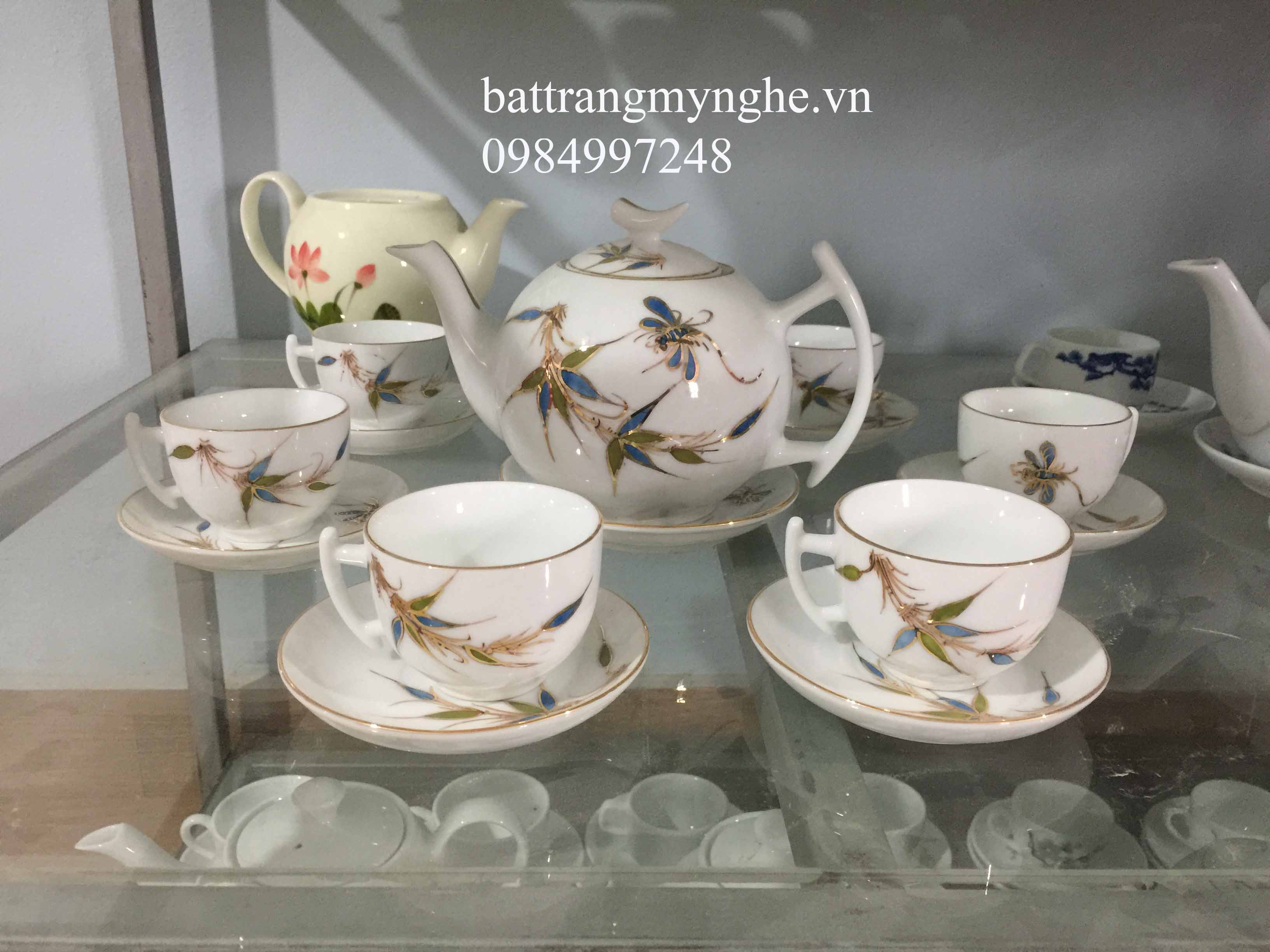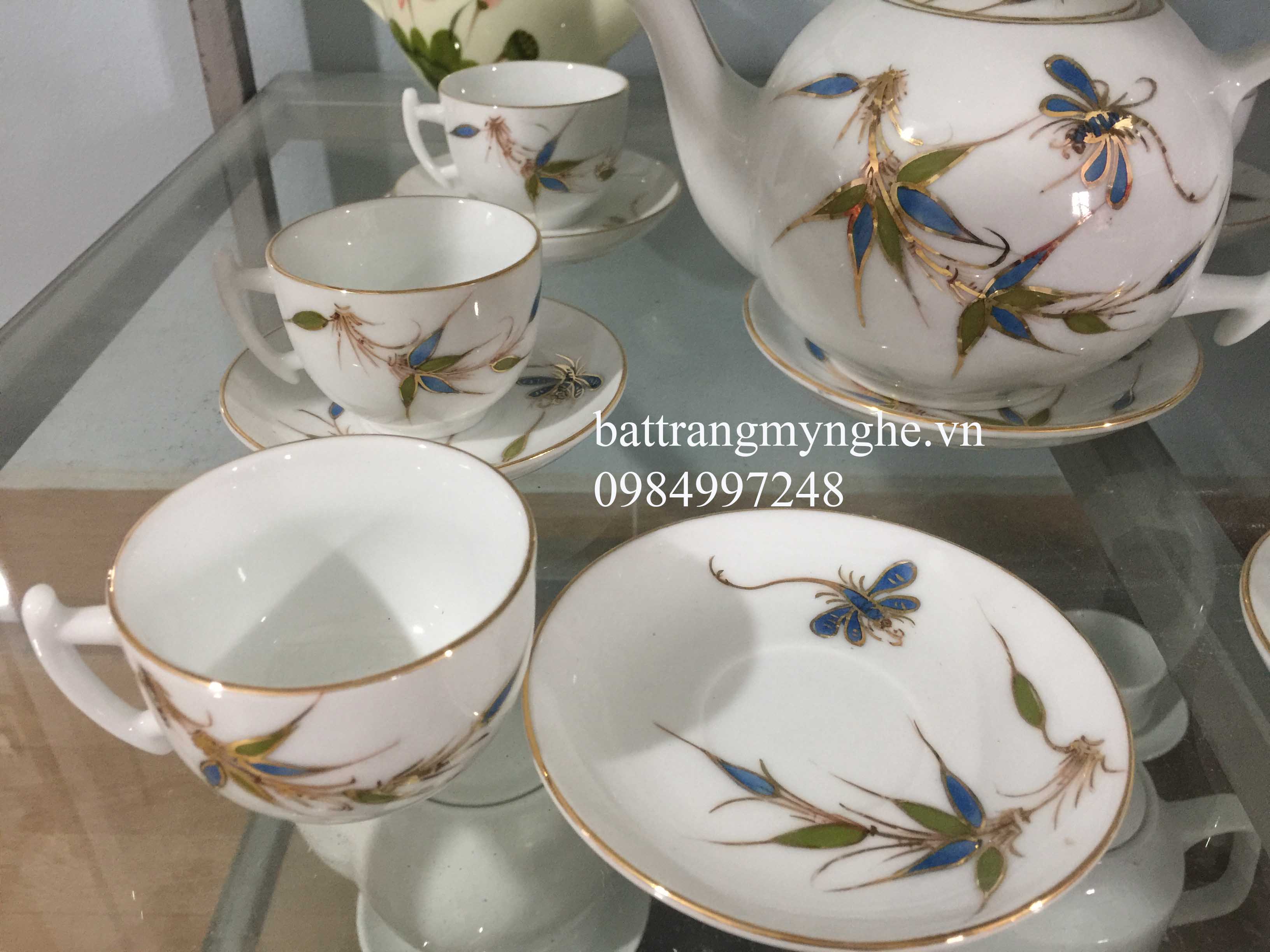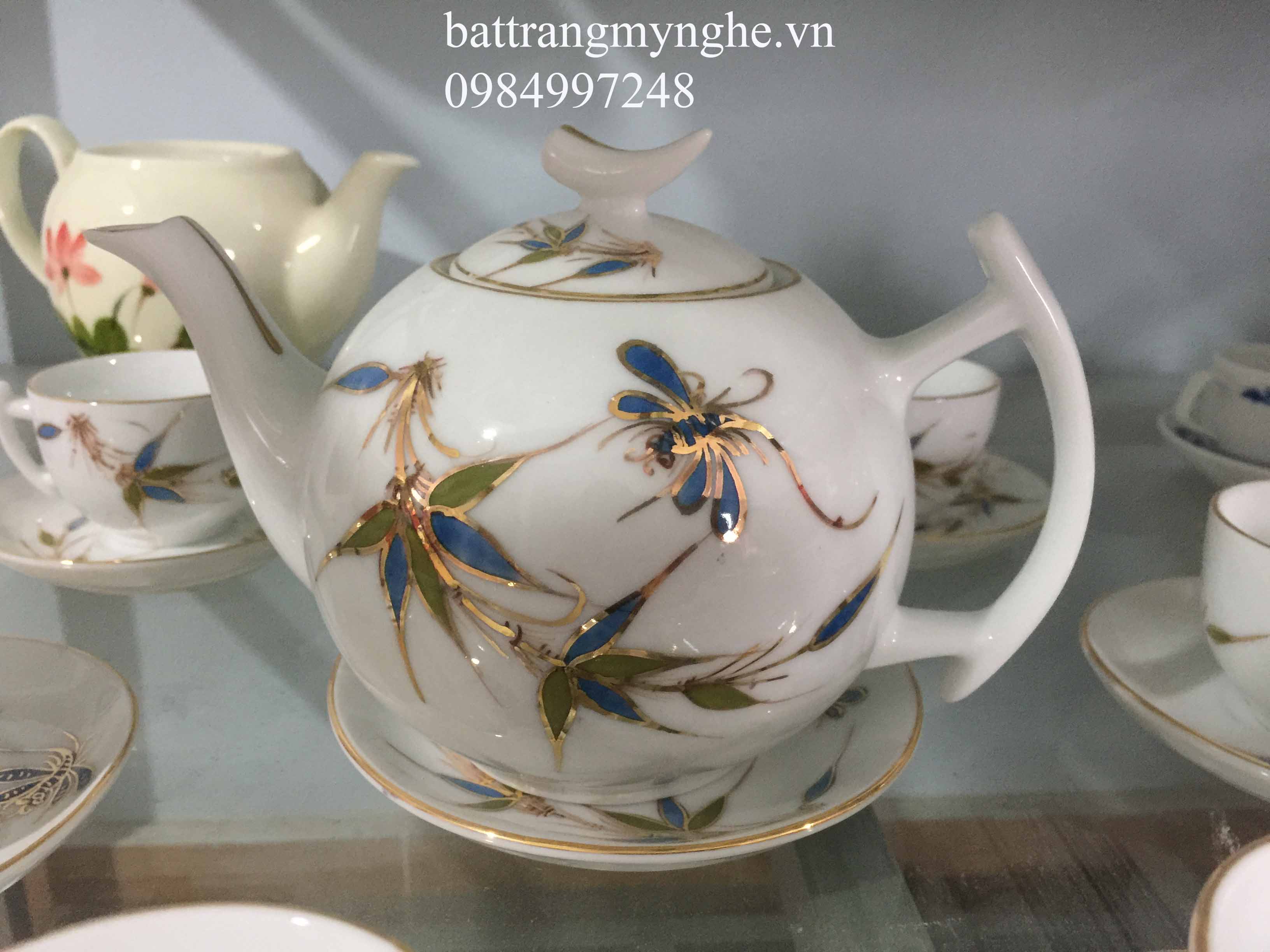 Bộ sản phẩm được làm trên chất liệu gốm sứ Bát Tràng cao cấp. Họa tiết chuồn chuồn lá trúc viền vàng kim vẽ nổi tạo nét riêng có độc đáo của sản phẩm. Khi sử dụng bạn sẽ thấy hết ưu điểm của dòng sản phẩm cao cấp này: dễ dàng chùi rửa, không bám nước chè, họa tiết đồng điệu từ ấm, chén đến phụ kiện