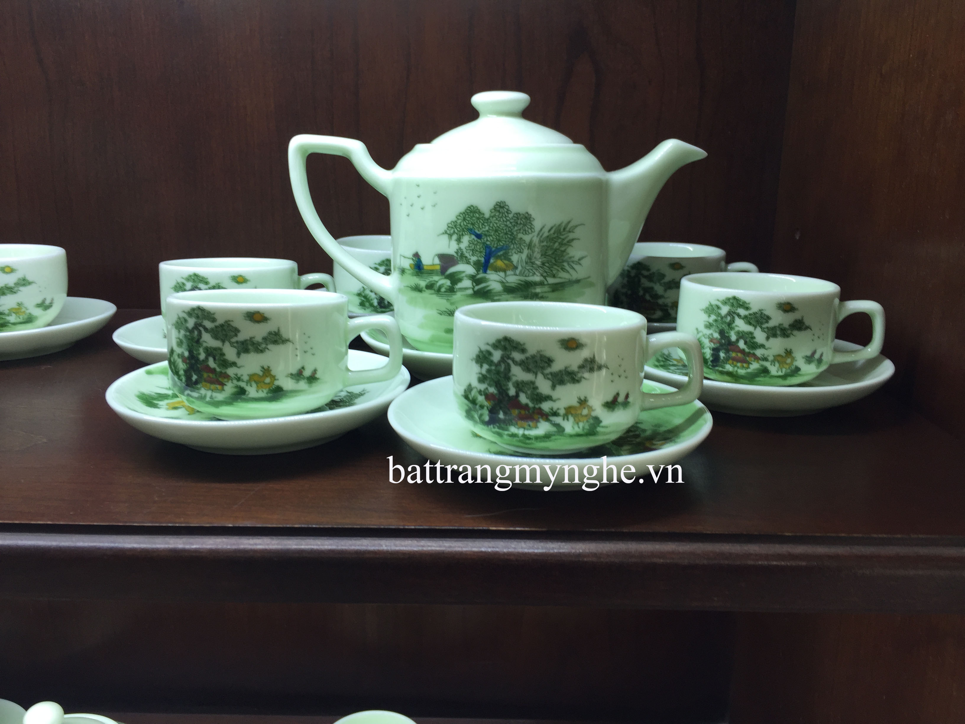 Bộ ấm chén dáng vuông cao vẽ cảnh cao cấp
