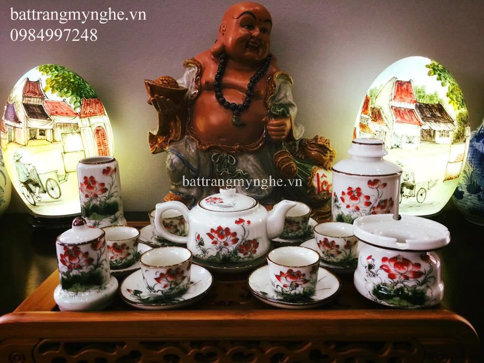 Bộ ấm chén men kem vẽ hoa sen - đầy đủ phụ kiện và khay