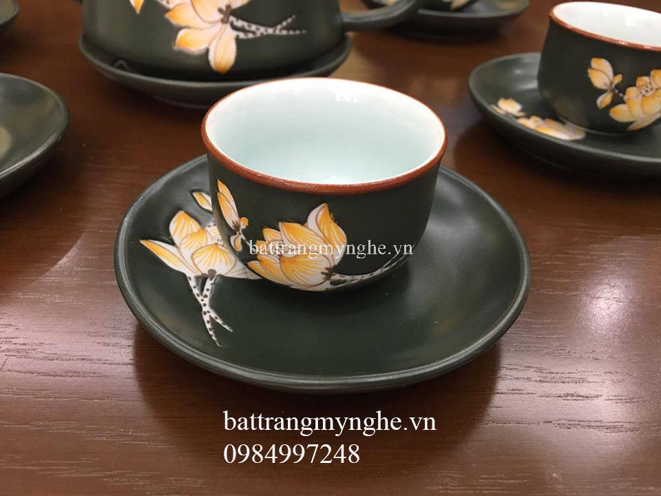 Bộ ấm chén vai vuông hoa sen - men xanh lục - đầy đủ phụ kiện được làm từ chất liệu đất đặc trưng của bát tràng. Mỗi bộ mang trên mình những nét tinh túy riêng. bên trong mỗi bộ đều được tráng một lớp men đặc trưng mà không nơi nào có tạo nên vẻ đẹp tinh tế của bộ bình trà. Khi pha trà vào chén ta sẽ thấy được sự kết hợp rất ăn ý giữa màu men men xanh lục và màu xanh của trà , chính sự hòa quện này đã tạo nên phong cách trà đạo truyền thống việt nam. Ngày nay bộ ấm chén trên được rất nhiều người ưa chuộng vì vẻ đẹp tinh tế toát ra từ bộ bình trà. hoa văn đơn giản vẽ tay, vì thế bộ ấm chén vai vuông hoa sen - men xanh lục phù hợp với việc trưng bày trong phòng khách ( trên bàn gỗ, bàn kính ) hoặc dùng ở sân vườn, phù hợp với cả những ngôi nhà cổ và sự hòa quện giữa cổ điển và hiện đại trong những căn nhà mới… Đặc biệt bộ ấm chén trêncó ưu điểm không bám nước chè. Mỗi lần sử dụng chỉ cần tráng nước nòng mà không cần rửa bề mặt lại trở nên nhẵn bóng, sạch sẽ. Kiểu dáng thiết kế cũng độc đáo và lạ mắt mỗi bộ ấm chén là một thể loại kiểu dáng khác nhau.