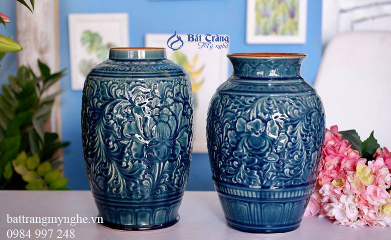 Bộ đôi lọ hoa anh em khắc hoa văn men xanh để bàn làm việc