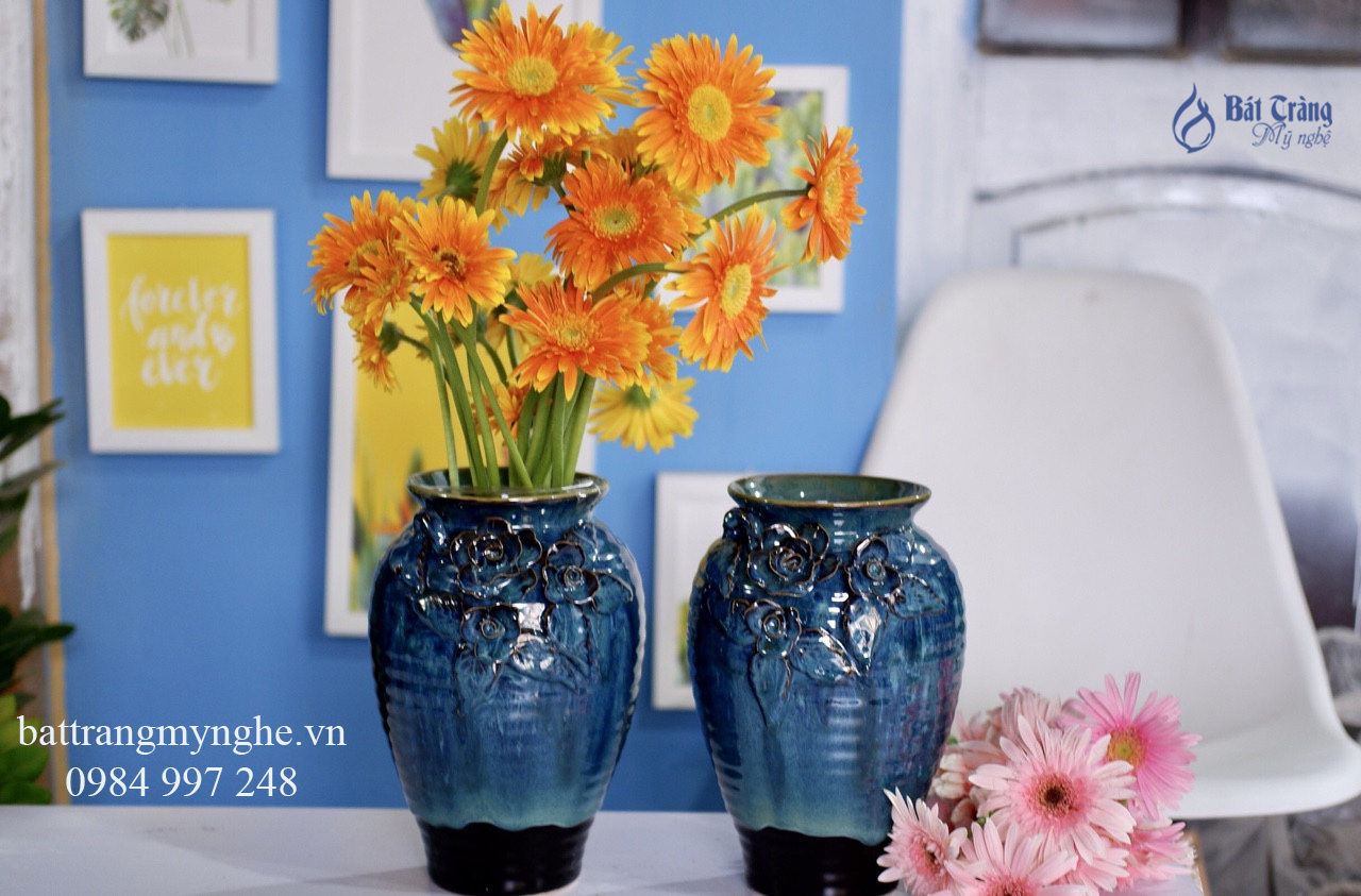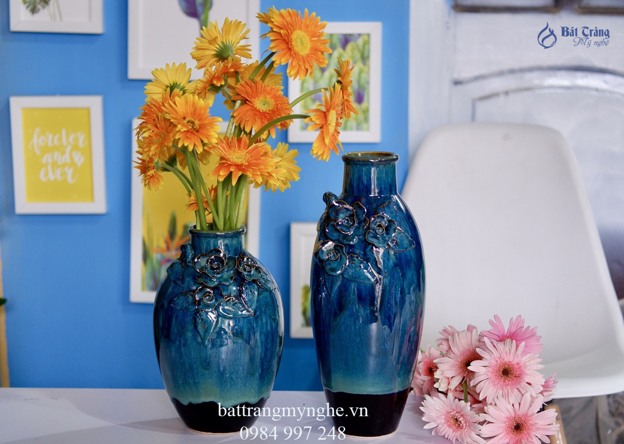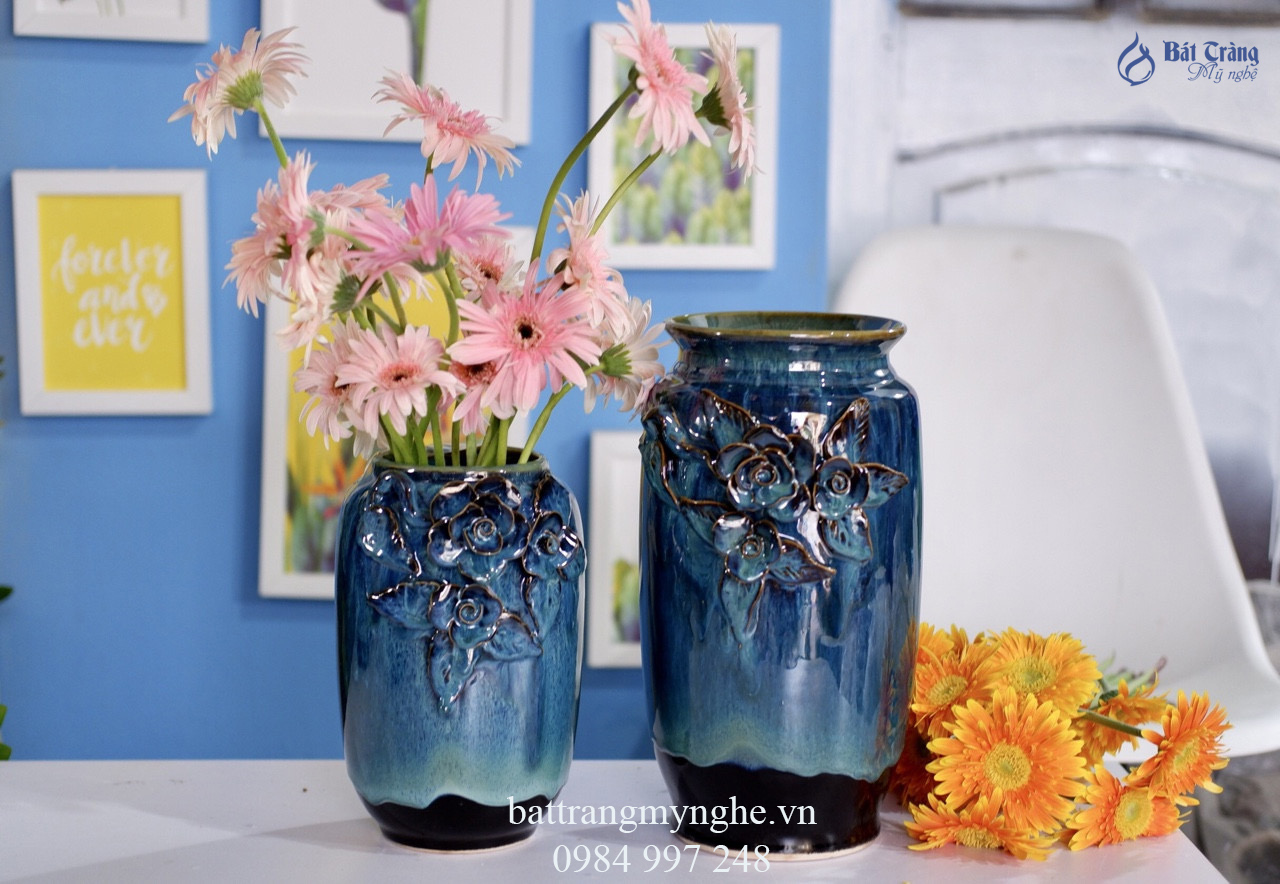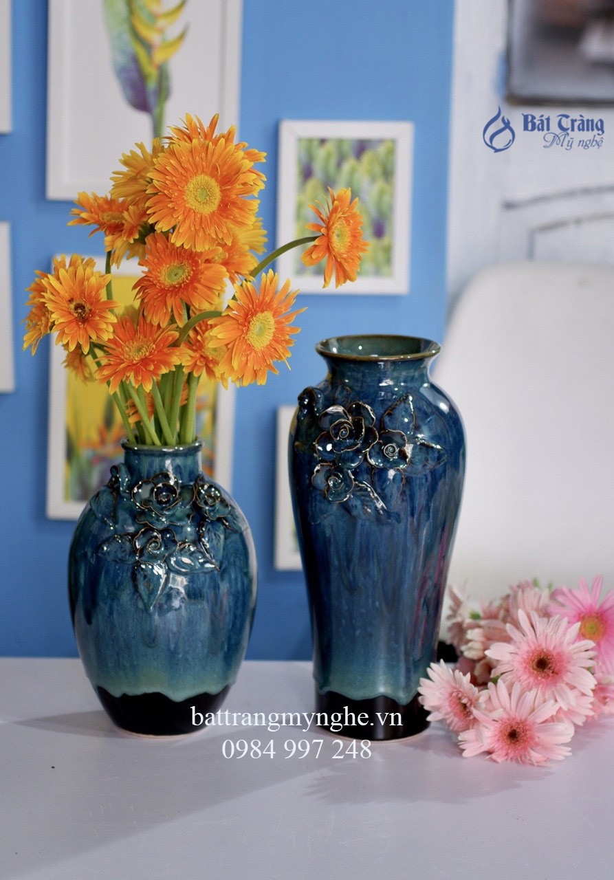 1 bộ gồm 2 lọ hoa đắp nổi từ thấp đến cao men xanh