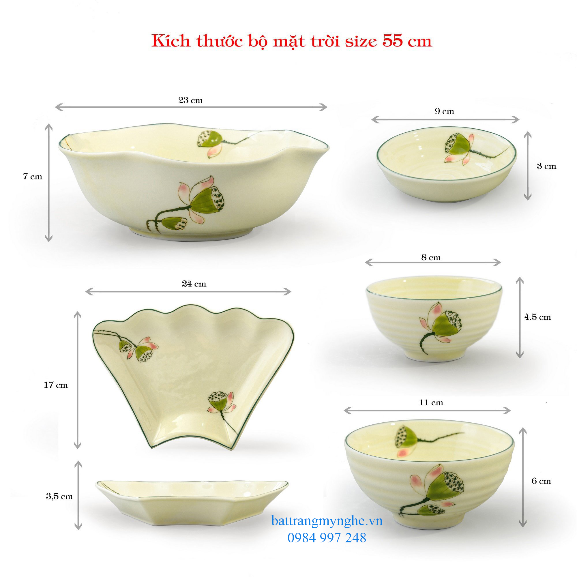 Bộ mặt trời size 55cm với bát tô đường kính 23 cm, đĩa cánh mặt trời đường kính 24cm, bát cơm đường kính 11cm, đĩa muối đường kinh 9cm, bát mắm đường kính 8cm giá 1600k