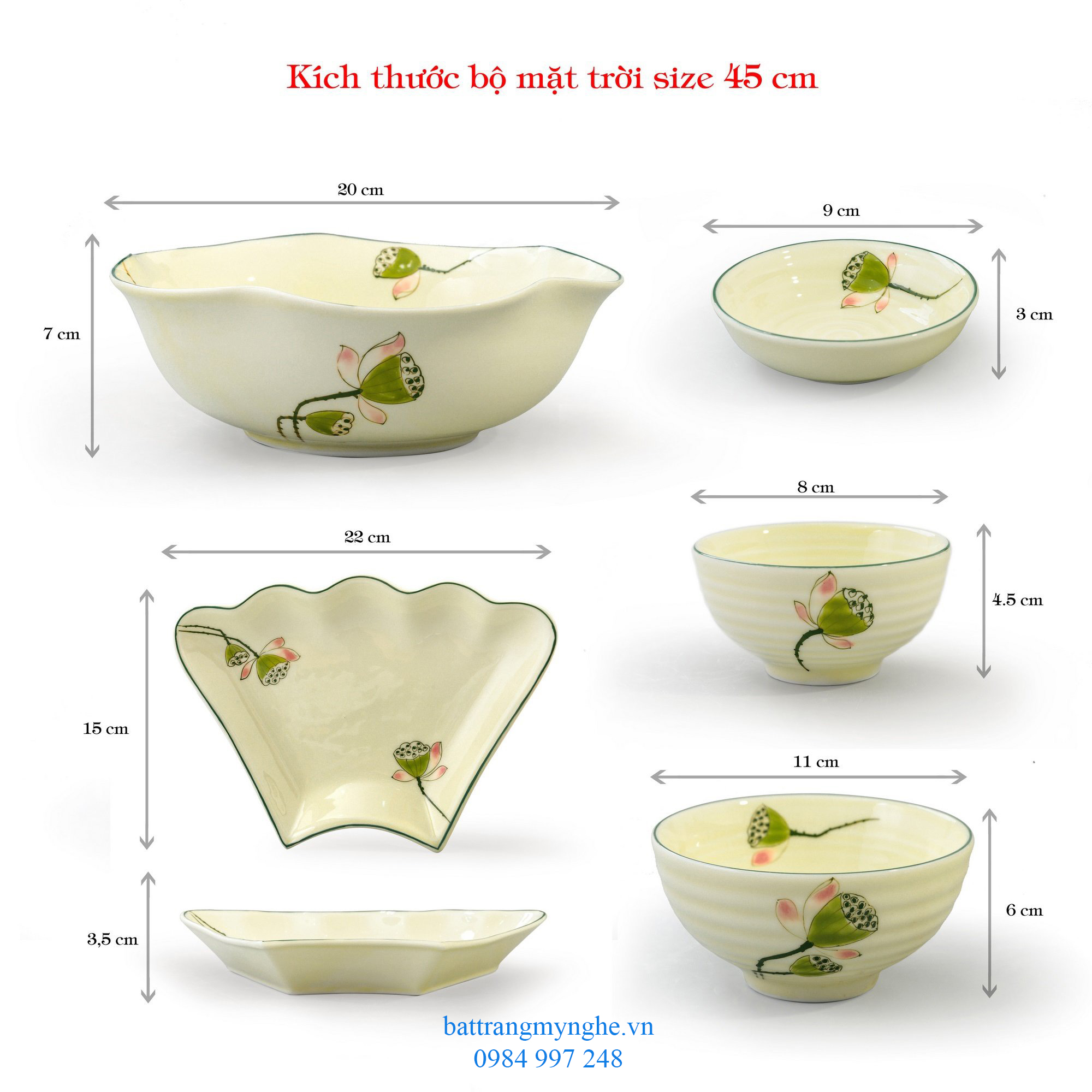 Bộ mặt trời size 45cm với bát tô đường kính 20 cm, đĩa cánh mặt trời đường kính 22cm, bát cơm đường kính 11cm, đĩa muối đường kinh 9cm, bát mắm đường kính 8cm giá 1400k