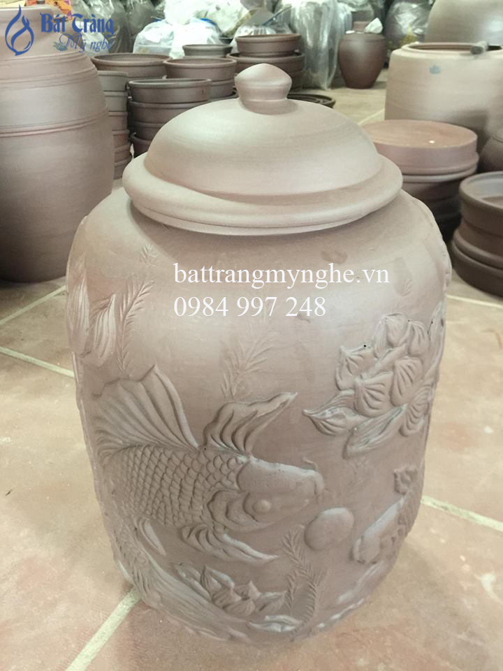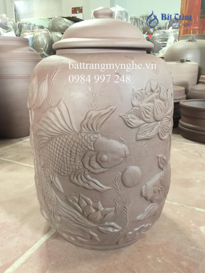 Chum Sành Bát Tràng ngâm rượu đắp nổi sen cá không tráng men 20l được tạo nên từ những bàn tay khéo léo của những người thợ gốm Bát Tràng. Vò ngâm rượu Bát Tràng được nung ở nhiệt độ 1200 – 1300 độ C, vò dày dặn, bền, đảm bảo khi ngâm trong thời gian dài mà không lo dò rỉ. Với uy tín nhiều năm sản xuất chum,vò rượu cho người tiêu dùng chúng tôi luôn luôn mang đến cho khách hàng những sản phẩm tốt nhất về chất lượng và giá thành.
