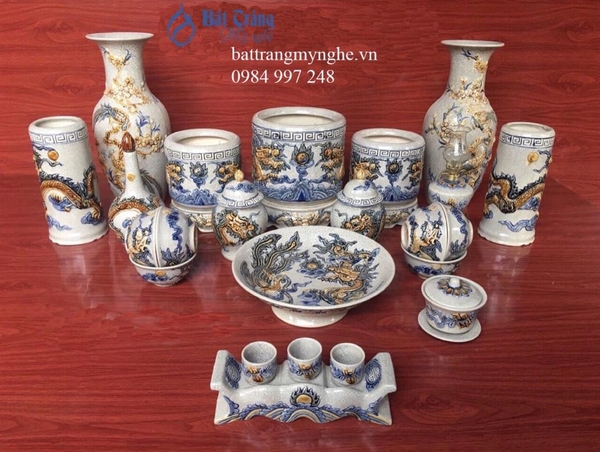 Bộ sản phẩm đồ thờ cúng men rạn có thể bắt gặp rất nhiều hiện nay với những sản phẩm nổi bật như: lư hương đỉnh hạc, bát hương, mâm bồng, ống hương, chân nến, lọ hoa, chén nước,…. Để hoàn thành được một bồ đồ thờ cúng men rạn cần trải qua rất nhiều công đoạn và chi tiết thể hiện sự cầu kỳ cũng như tâm huyết với nghề của người thợ.