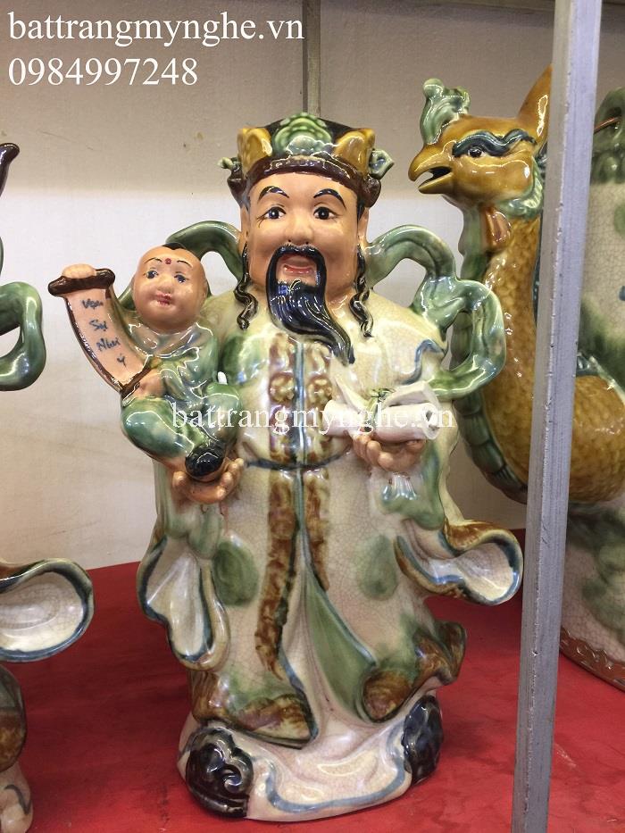 Tượng Phúc Lộc Thọ được nung ở nhiệt độ 1200 đến 1300 độ C nên có độ bền rất cao. Bên ngoài được tráng 1 lớp men đặc trưng của Bát Tràng , các hoa văn họa tiết được làm hoàn toàn thủ công mang đậm nét truyền thống của làng nghề.